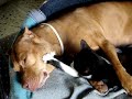 Gata faz uma massagemUma amistosa gatinha faz uma massagem "focinhal" a um pitbull.  |